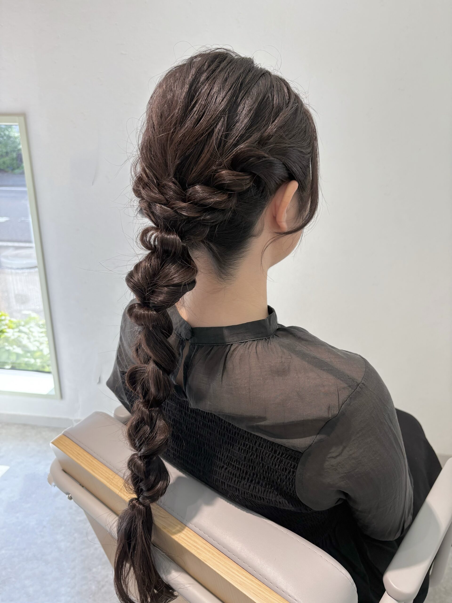 ロープ編みやくるりんぱ、みつあみなどをミックスさせ ボリュームのある仕上がりに♪ 飾りがなくてもとってもかわいいです!